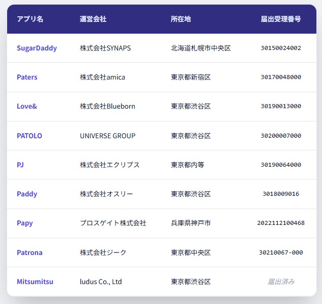 | SugarDaddy | 非公開 | 30〜50代 | 20〜30代 |