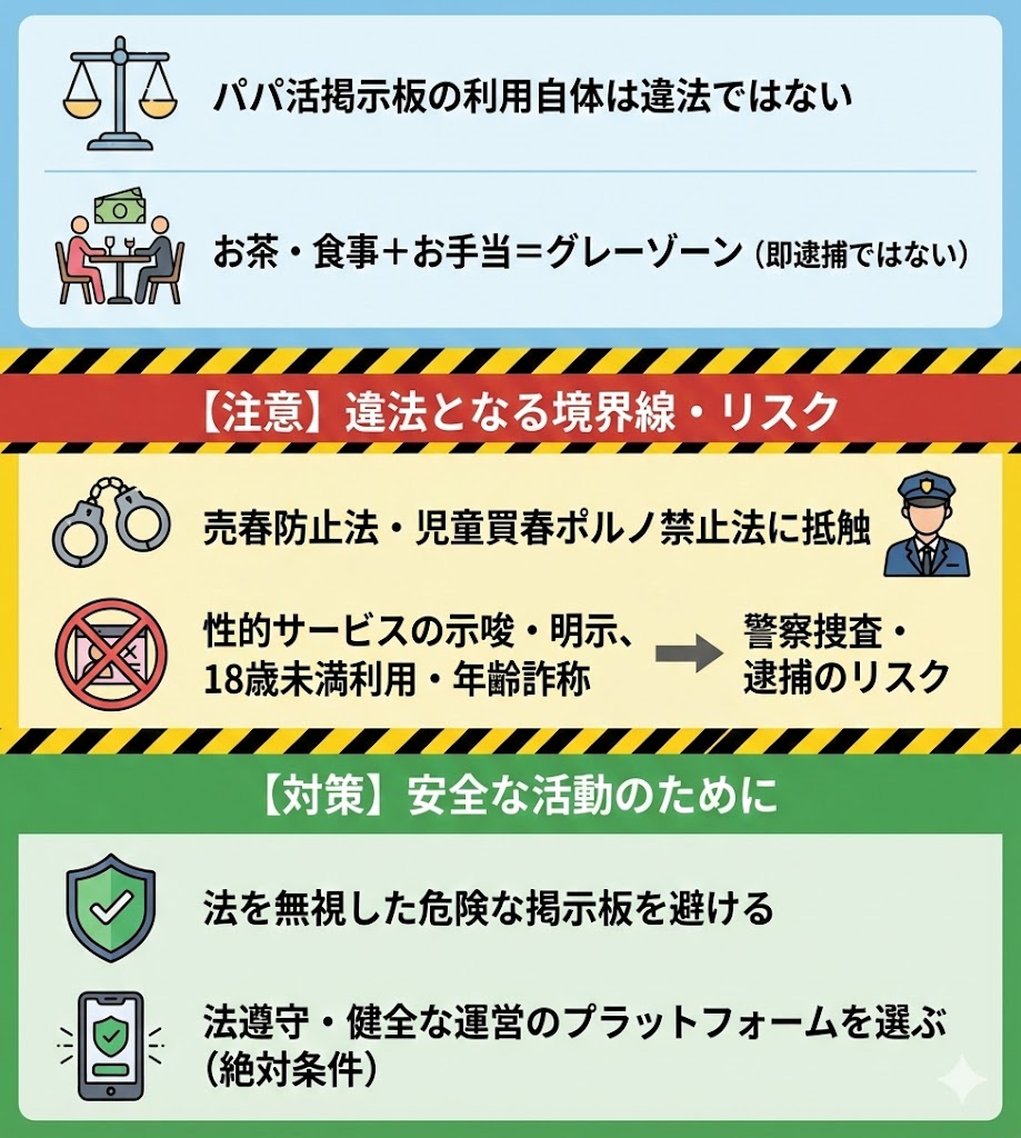 「パパ活掲示板を使うこと自体が犯罪になるのでは?」と心配する声もありますが、結論から言うと、単なる出会いの場としての利用は違法ではありません。