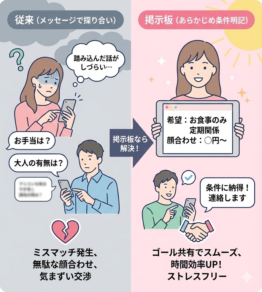 アプリのメッセージ機能だと、マッチングしてから何度もやり取りを重ね、ようやく条件の話になることが多いですが、掲示板なら最初から条件をオープンにして募集をかけることができます。