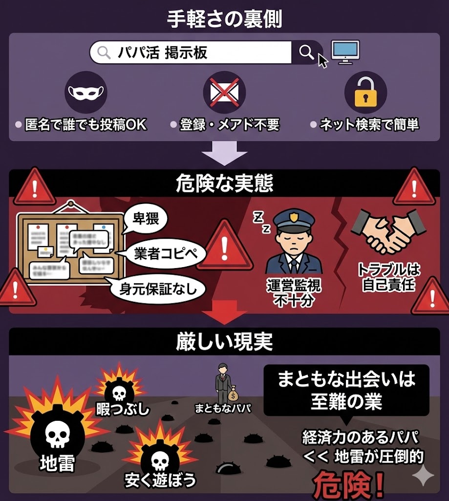 正直なところ、初心者がこうした無料掲示板でまともなパパを見つけるのは至難の業です。