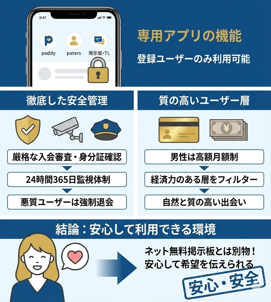 アプリ内の掲示板には、厳格な入会審査や身分証による年齢確認をクリアした人しかいません。また、24時間365日の監視体制があり、不適切な投稿や勧誘はすぐに削除され、悪質なユーザーは強制退会させられる仕組みが整っています。